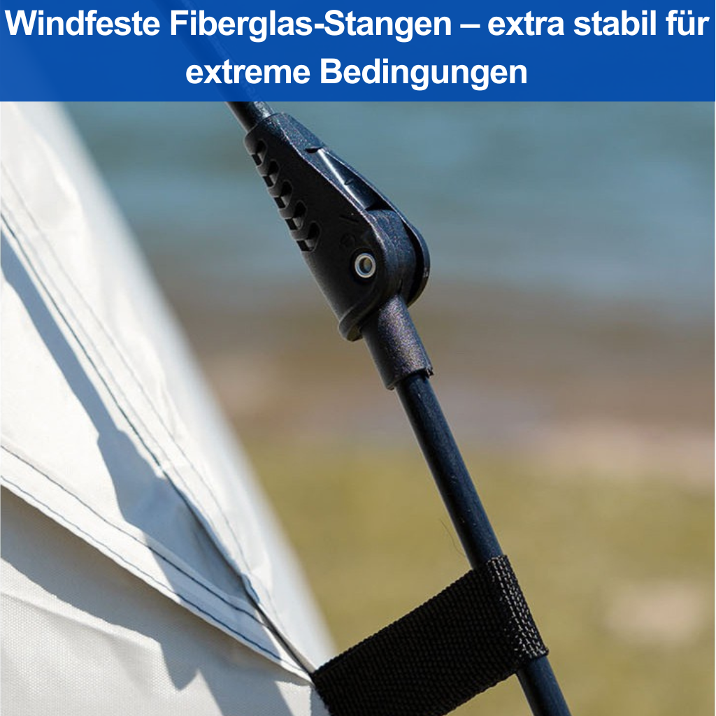 Dank verstärkten Fiberglas-Stangen und wasserfestem Material hält das Zelt Windböen und Regen stand. Perfekt für alle Wetterbedingungen!