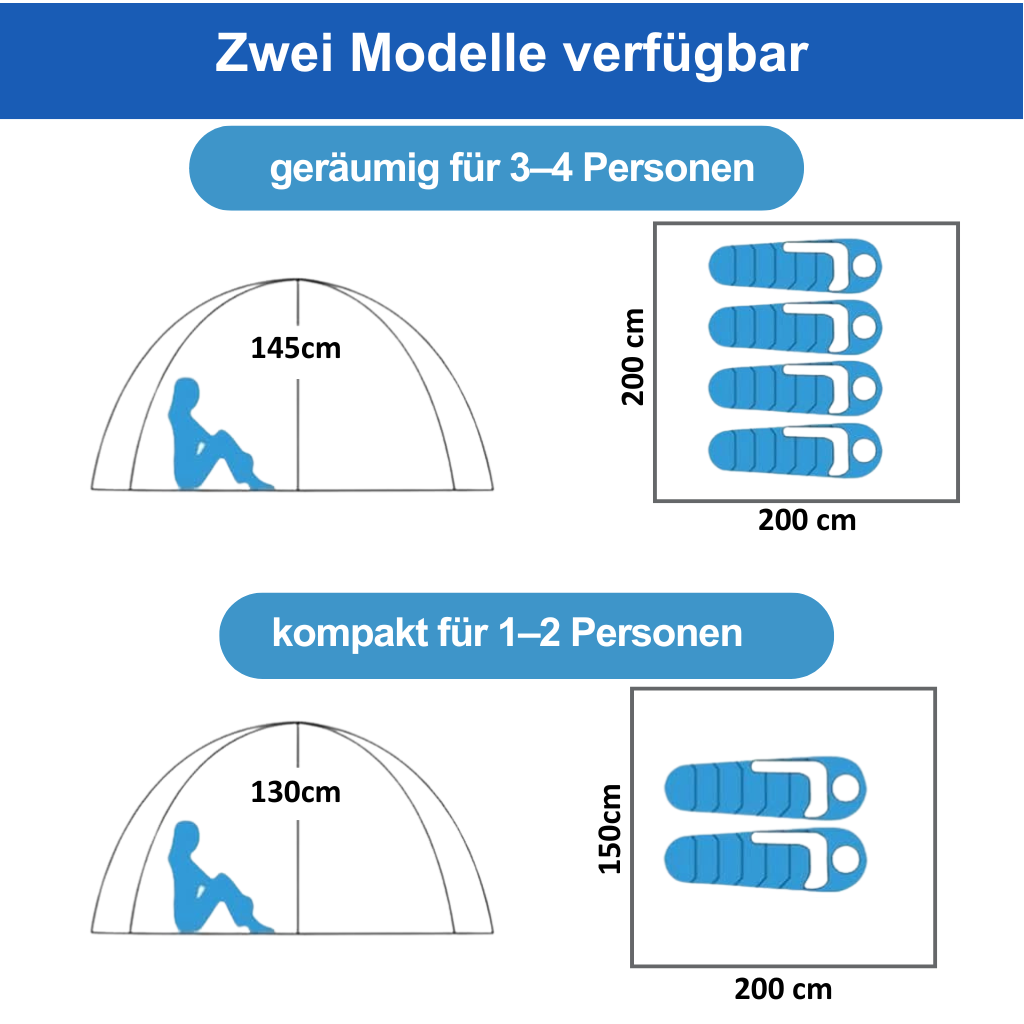 Es gibt zwei Modelle: 1-2 Personen (200x150x130 cm) oder 3-4 Personen (200x200x145 cm).